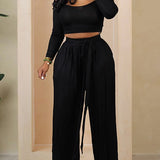 - Boat Neck, Long Sleeves, Tied Elastic Waist, Wide Leg