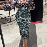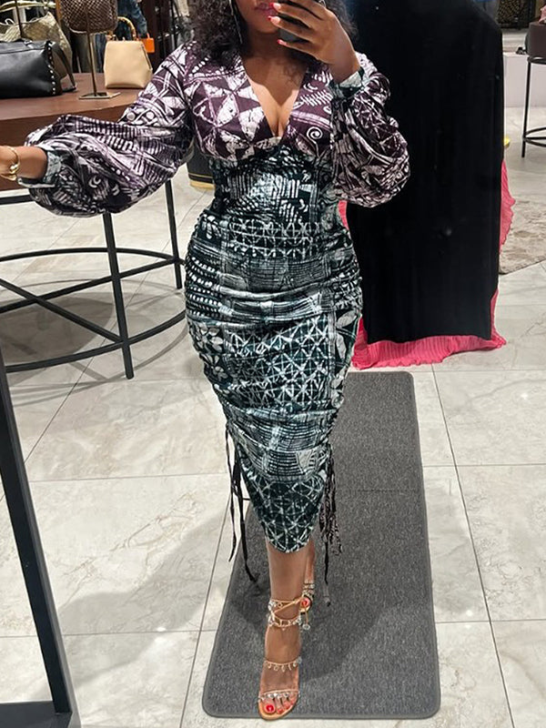 Printed V-Neck Drawstring Dress